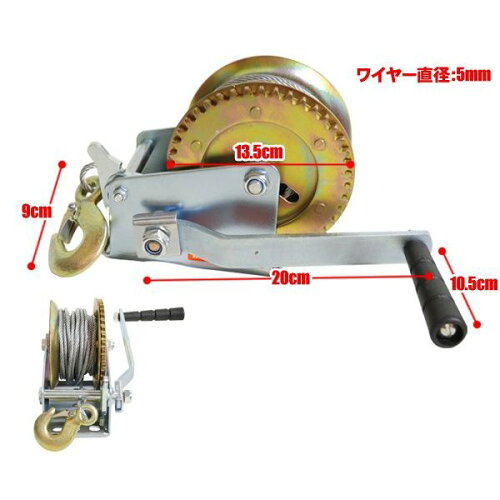 【商品概要】サイズ(約):フック全長9cmワイヤー巻取り部直径13.5cmハンドル全長20cm ハンドル取っ手10.5cmワイヤー直径5mワイヤー全長9m※輸入品 ※取扱説明書は付属しておりません。